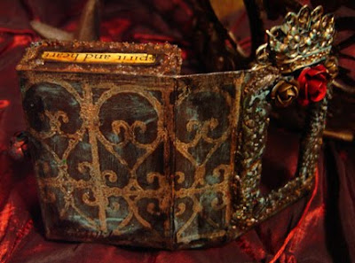 These are altered matchboxes in two sizes done with acrylic paints and mediums, mica, found objects and more. These were demo pieces for Alpha Stamps so the blank matchboxes, many of the metal embellishments and collage images can be found on their site. Enjoy!